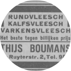 Slagerij Thijs Boumans was de eerste onderneming in het pand waar Lokaal De Ruyter nu gevestigd is. Slagerij Thijs Boumans was een rund-, kalf- en varkensvlees-slagerij met billijke prijzen, zoals ze dat vroeger zeiden. In onze kelder op weg naar de toiletten vindt u een aantal foto's van de slagerij.